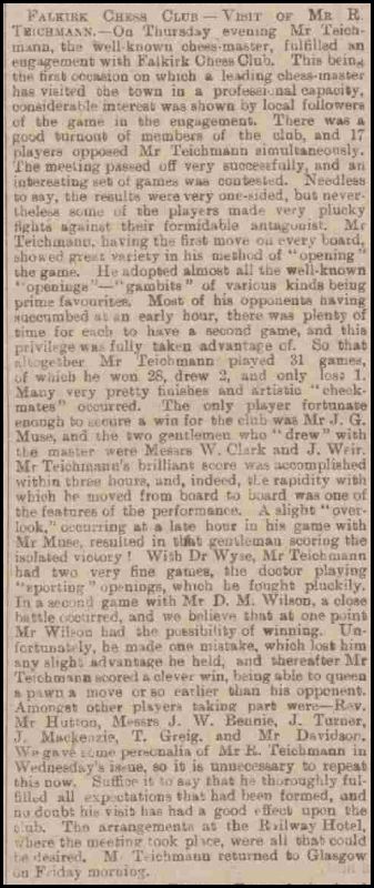 On 21 November 1901 Teichmann visited the Falkirk Chess Club, the first ever such visit by a master of his standing. (A.J. Neilson, who edited the chess column in the Falkirk Herald and Midland Counties Journal was connected to the club, as well as Glasgow CC.) He gave a simultaneous display at the Railway Hotel over 31 boards (some players, whose games had finished quickly, chose to play again), scoring 28 wins, two draws (W. Clark and J. Weir) and only one loss (J.G. Muse).