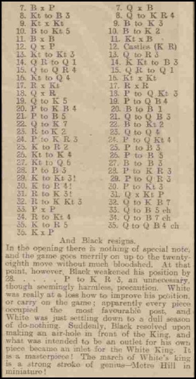 Somewhat ironically, A.J. Neilson, the chess editor of the Falkirk Herald and a member of Glasgow CC, only became aware of the game after seeing it in an Australian newspaper, and it in turn had received the game via two USA newspapers. The following report, it will be noted, states the game "occurred recently" in Glasgow.